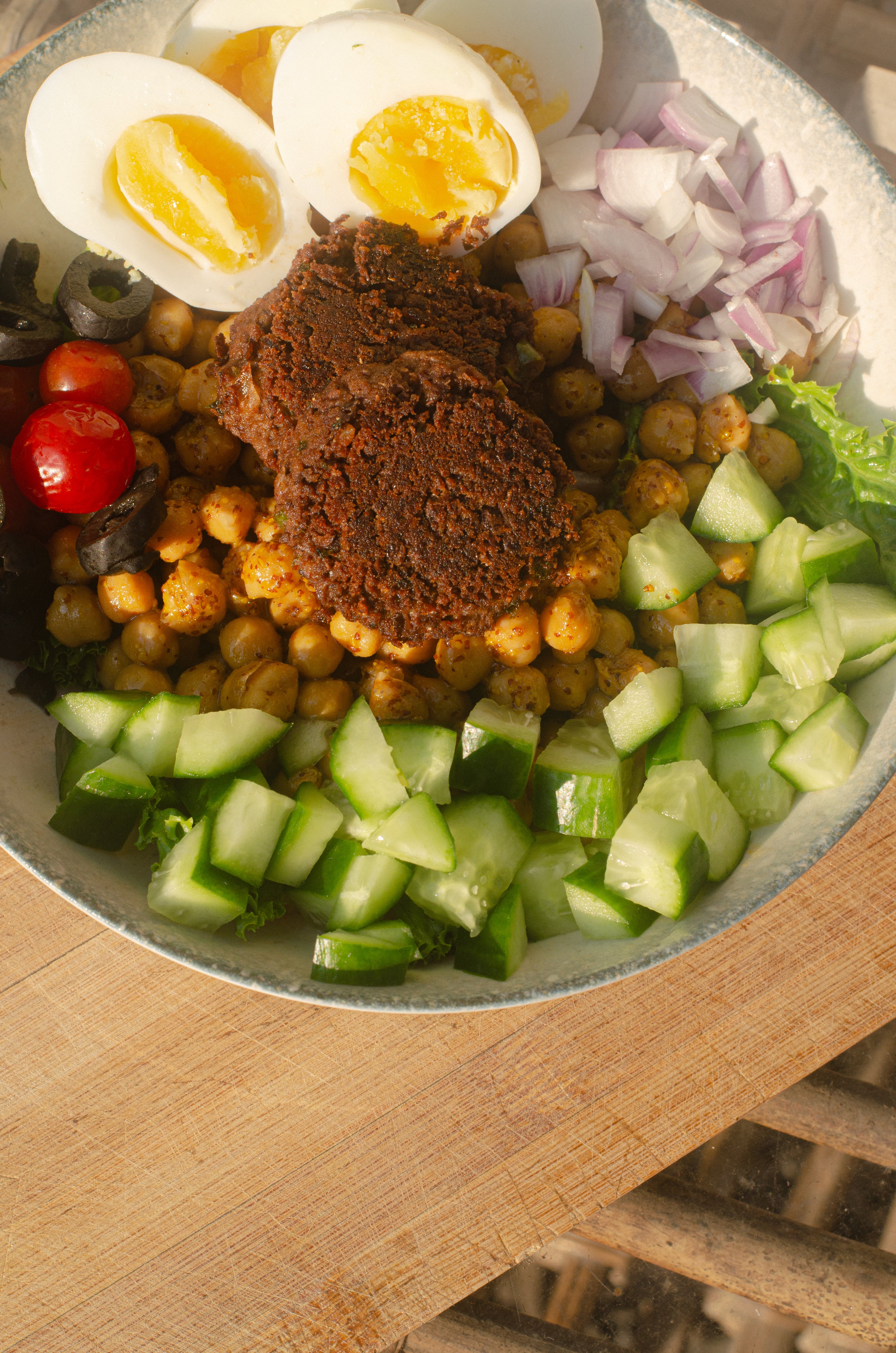 A protein-rich bowl with chickpeas, eggs, and fresh vegetables — vibrant and energizing.